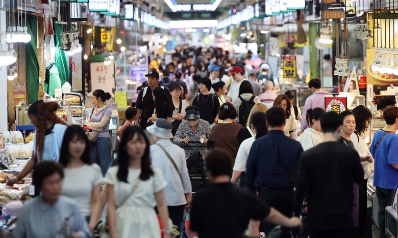 정부가 소비 진작 등 내수 활성화를 위해 20조 원 규모의 2차 추가경정예산안을 국무회의에서 의결한 가운데 19일 서울 마포구 망원시장이 장을 보는 시민들로 붐비고 있다. 뉴스1 |