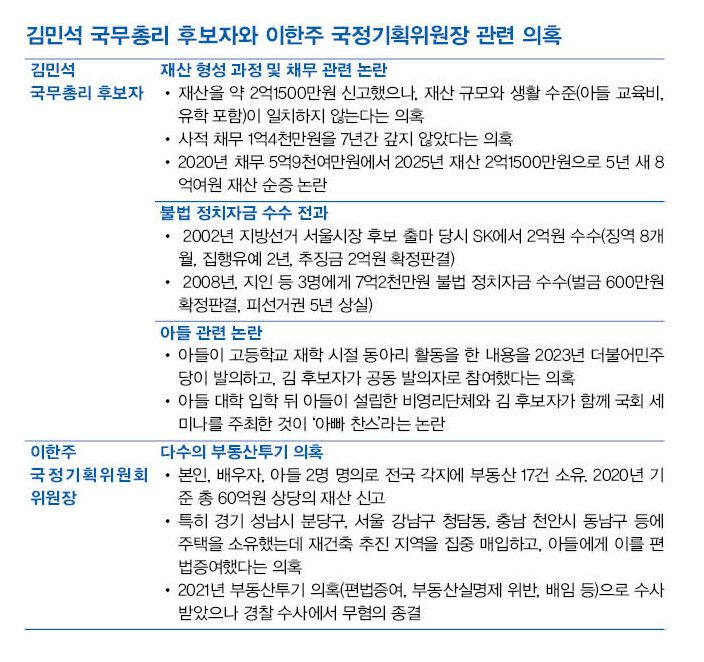 이재명 대통령은 ‘돌파’를 선언했다. 주요 7개국(G7) 정상회의 참석차 캐나다로 출국한 이 대통령은 2025년 6월16일(현지시각) 전용기 즉석 기자간담회에서 김민석 국무총리 후보자의 채무 거래 및 정치자금 의혹과 이한주 국정기획위원회 위원장의 부동산투기 의혹 등에 대해 “검증하는 것은 불가피”하지만 “청문회 과정에서 충분히 설명할 수 있으리라 생각된다”고 말했다. 내란 혐의로 탄핵된 윤석열 정부의 기저효과를 누리며, 여러 ‘비정상’을 ‘정상화’하는 듯한 모습을 보이는 이재명 정부는 ‘인사 검증’이라는 첫 번째 암초를 무사히 넘어갈 수 있을까.