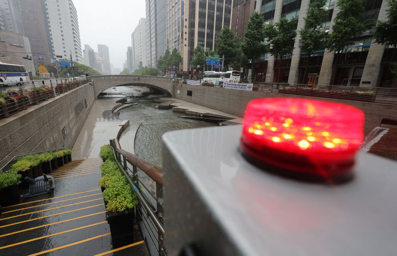 서울 전역에 호우주의보가 내려진 20일 서울 청계천 산책로 출입이 통제되고 있다. 연합뉴스