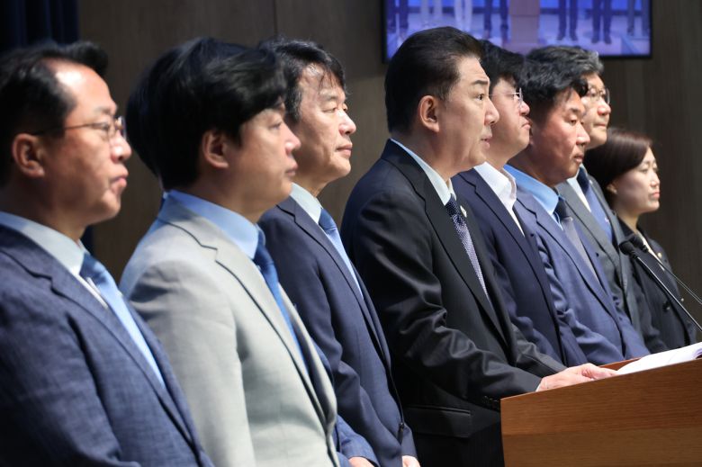 김병기(왼쪽 네번째) 더불어민주당 신임 원내대표가 15일 서울 여의도 국회 소통관에서 원내지도부 인선을 발표하는 모습. 왼쪽 세번째가 문진석 원내운영수석부대표. [연합] |