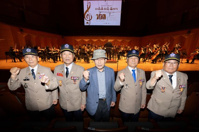 KT가 후원한 ‘마음을 담은 클래식’ 공연에 참석한 국가유공자들이 기념촬영을 하고 있다. /사진=KT |