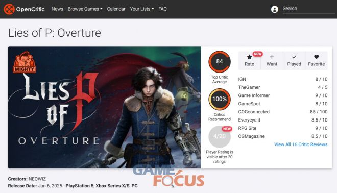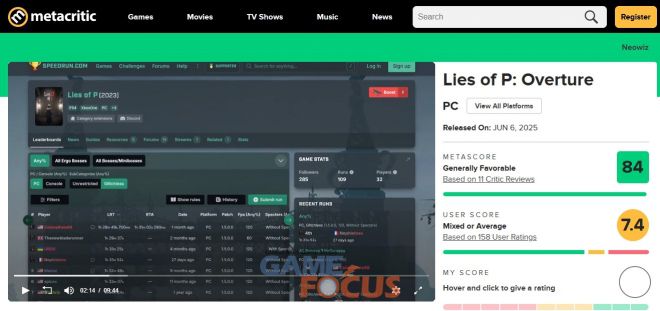 ‘P의 거짓: 서곡’은 출시 직후 스팀 ‘최고 인기 게임’ 순위에서 국내 전체 부문 1위, 글로벌 유료 부문 1위를 차지했다. 메타크리틱 평점 84점, 오픈크리틱 평점 84점을 기록하며 평단에서도 호평받았다. 특히, 오픈크리틱에서는 최고 추천 등급인 ‘마이티’를 획득했다.