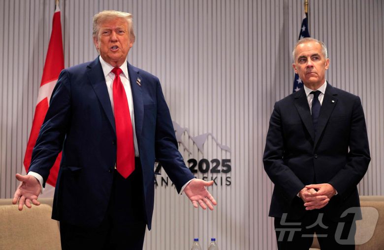 16일(현지시간) 도널드 트럼프 미국 대통령이 캐나다 앨버타주 캐내내스키스에서 열린 주요 7개국(G7) 정상회의를 계기로 마크 카니 캐나다 총리와 만나고 있다. 2025.06.16 ⓒ AFP=뉴스1 ⓒ News1 김지완 기자