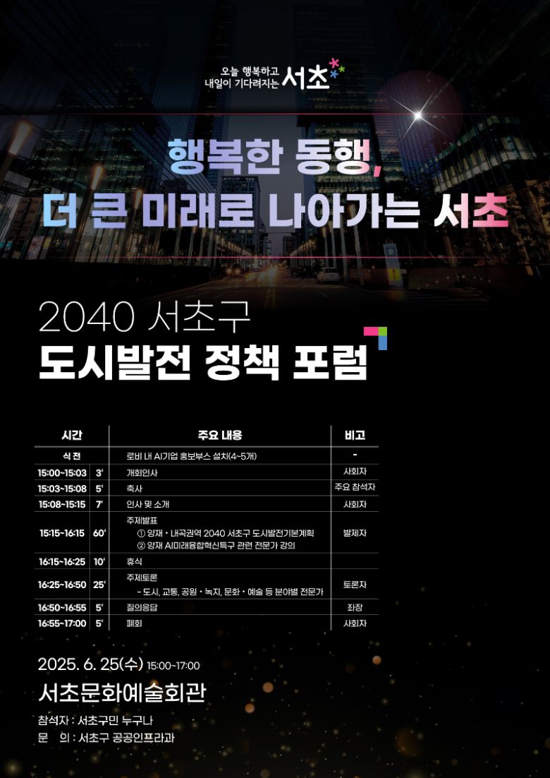 서울 서초구가 25일 서초문화예술회관에서 ‘양재·내곡권역 2040 서초구 도시발전 정책포럼’을 개최한다. 이번 포럼은 ‘2040 도시발전기본계획’의 비전과 핵심 추진 전략을 주민들과 공유하고, 지역 전문가 및 유관기관, 시·구의회 관계자 등 600여 명과 함께 실행 가능한 정책 대안을 논의하기 위해 마련됐다.
