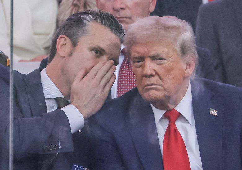 피트 헤그세스(왼쪽) 미국 국방부 장관이 미 육군 250주년 기념일인 14일 워싱턴 D.C에서 도널드 트럼프 미국 대통령과 대화하고 있다./로이터 연합뉴스