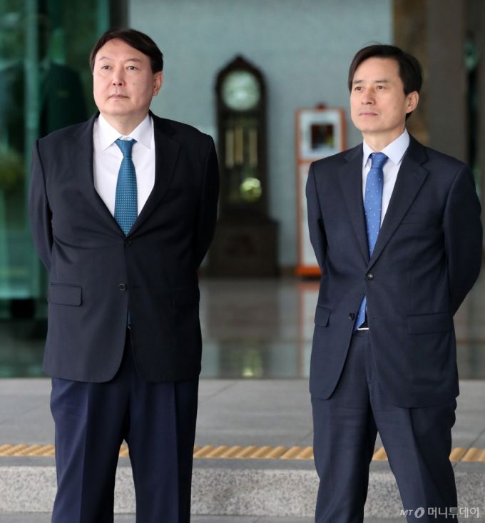 (서울=뉴스1) 오대일 기자 = 이재명 대통령이 12일 내란특검법에 따른 특별검사로 민주당이 추천한 조은석 전 감사원장 권한대행을 지명했다. '내란 종식'이라는 막중한 임무를 짊어진 조 전 대행은 감사원 감사위원 시절 전현희 권익위원장에 대한 감사 문제로 윤석열 정부 감사원 수뇌부와 정면 대립하며 각을 세운 바 있다. 조 특검은 13일 오전 기자들에게 보낸 입장문에서 "수사에 진력해온 국가수사본부·고위공직자범죄수사처·검찰의 노고가 헛되지 않도록 최선을 다하겠다"며 성실한 특검 수행을 약속했다. 사진은 지난 2017년 10월 23일 조은석 당시 서울고검장(오른쪽)과 윤석열 서울중앙지검장이 서울고검에서 열린 국회 법사위 국정감사에 앞서 국감장에 도착하는 의원들을 기다리는 모습. 2025.6.13/뉴스1 Copyright (C) 뉴스1. All rights reserved. 무단 전재 및 재배포, AI학습 이용 금지. /사진=(서울=뉴스1) 오대일 기자