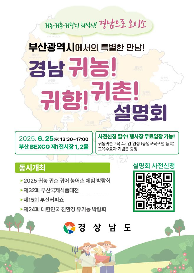 아시아투데이 허균 기자 = 경남도는 오는 25일 부산 벡스코 제1전시장에서 재부산향우회, 귀농·귀촌 희망자 등 100여명을 대상으로 귀농·귀촌·귀향 설명회를 개최한다.