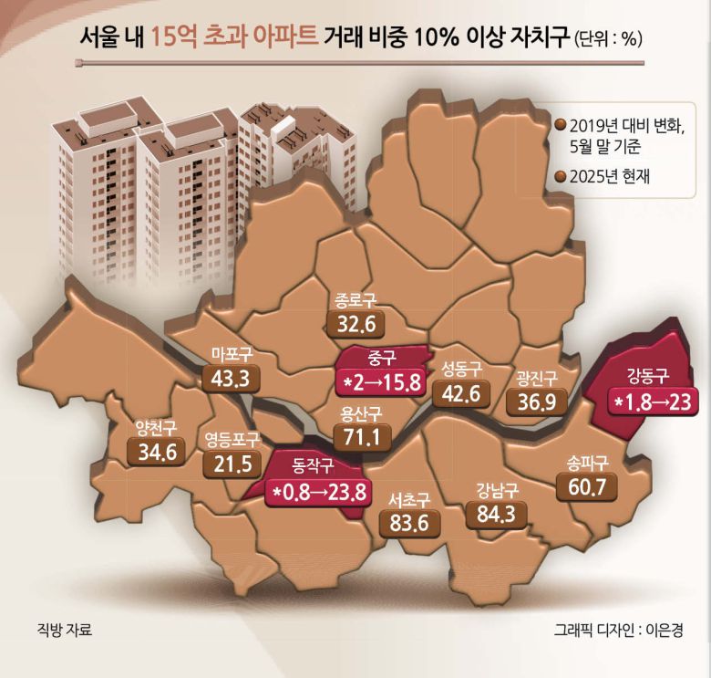 ▶서초 옆 ‘동작’ 15억 초과 아파트 거래 24%=20일 헤럴드경제가 직방에 의뢰해 국토교통부 실거래가 자료를 분석한 결과에 따르면, 15억원 초과 아파트 비중이 10%를 넘는 서울 자치구 수는 2019년 강남3구(강남·서초·송파구) 및 용산구 등 4곳에서 2025년 5월 말 기준 13곳으로 가파르게 늘었다. 15억원은 문재인 정부가 2019년 ‘12·16 대책’ 당시 해당 가격이 넘는 아파트의 주택담보대출을 전면 금지하며 규제의 기준으로 제시한 ‘초고가 아파트 가격’이다.