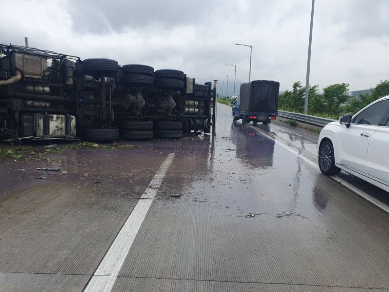 지난 16일 오전 11시24분께 경남 김해시 진영읍 부산외곽선 순천방면 진영분기점 램프에서 A씨(60대)가 운전하던 25t 탱크로리가 빗길에 미끄러져 넘어지는 사고가 발생했다. (사진=독자 제공) 2025.06.16. /사진=뉴시스 |