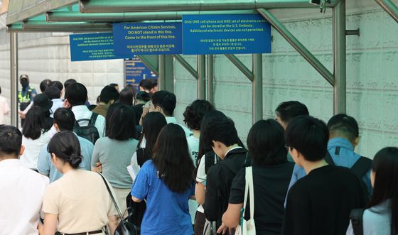지난달 28일 서울 종로구 주한 미국대사관 앞에서 미국 비자를 발급받으려는 사람들이 줄을 서 있는 모습. 연합뉴스 |