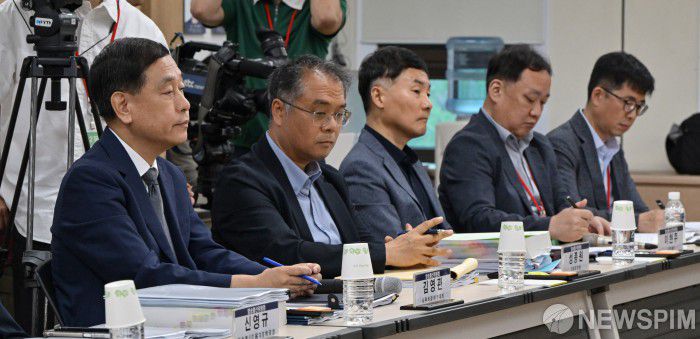 [과천=뉴스핌] 최지환 기자 = 김영관 방송통신위원회(방통위) 사무처장 직무대행을 비롯한 관계자들이 20일 오전 경기 과천시 정부과천청사 방통위에서 열린 국정기획위원회 방통위 업무보고에서 홍창남 국정기획위원회 사회2분과위원장의 모두발언을 듣고 있다. 2025.06.20 choipix16@newspim.com
