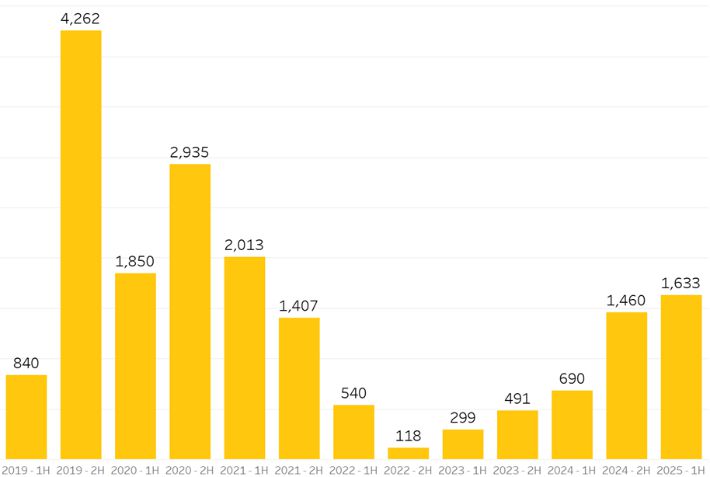 2019~2025년 반기별 서초·강남·송파구 신고가 거래 건수(2025년은 4월 말 기준). 집토스 제공