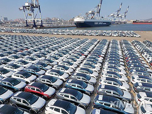 중국 산둥성의 옌타이항에서 선적을 기다리는 자동차들 |