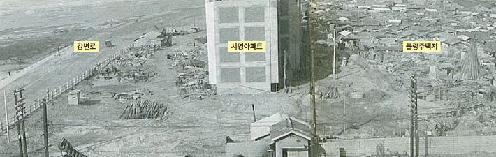 1968년 서부이촌동 경관. 강변로 옆 시영아파트는 안쪽의 불량주택지를 가리기 위한 목적도 있었다. 서울기록원 제공 |