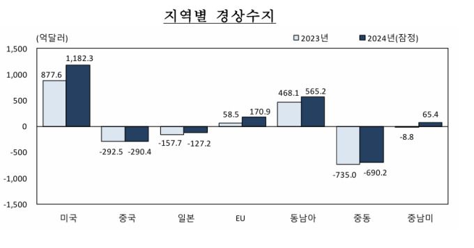 중동에 대해서는 상품수지가 기계류 등의 수출 증가와 국제유가 및 가스 가격 하락에 의한 원유, 가스 등 원자재 수입 감소로 690.2억 달러 적자로 전년(-735.0억 달러)에 비해 적자규모 축소 개선됐다. 중남미는 65.4억 달러 흑자로 전년(-8.8억 달러) 적자에서 흑자로 전환했다.