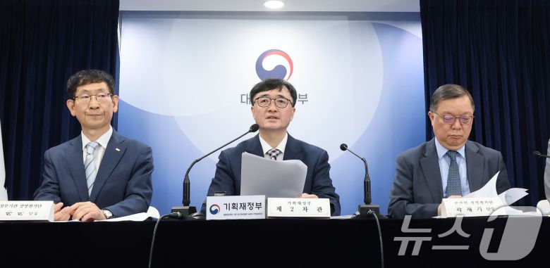 임기근 기획재정부 2차관이 20일 오전 서울 종로구 정부서울청사에서 2024년도 공공기관 경영평가 결과를 발표하고 있다. 왼쪽부터 김춘순 준정부기관 평가단장, 임 2차관, 곽채기 공기업 평가단장. 2025.6.20/뉴스1 ⓒ News1 임세영 기자 |