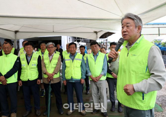 [이데일리 김태형 기자] 강호동 농협중앙회장이 20일 경기도 화성시 포도농가 일손돕기에서 봉사활동에 참석한 임직원들을 격려하고 있다.