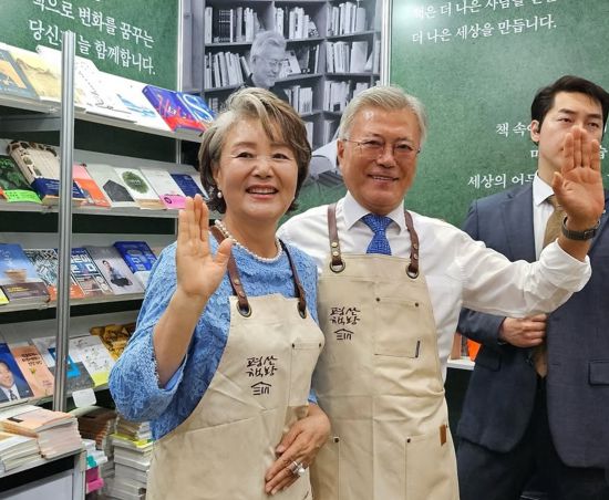 문재인 전 대통령과 배우자 김정숙 여사가 지난 18일 서울 강남구 코엑스에서 열린 서울국제도서전을 찾았다. 평산책방 인스타그램 |