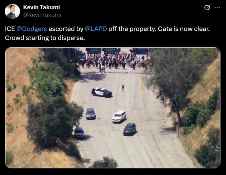 이날 LA다저스는 X(옛 트위터)에 “오늘 아침 ICE 요원들이 다저 스타디움에 와서 주차장 출입 허가를 요청했다”며 “하지만 경기장 입장을 거부했다”고 밝혔다. 뉴욕타임스(NYT)와 워싱턴포스트(WP) 등 외신들에 따르면 이날 오전 8시경 다저 스타디움 정문인 A 게이트 밖에 표식 없는 일련의 차량 행렬이 나타나 “처리해야 할 구금자가 있다”며 주차장 출입을 요구했다. LA다저스 구단은 이들의 경기장 출입을 거부했고, 연방 요원들은 E 게이트로 이동했다. 이즈음 소셜미디어에는 다저 스타디움 게이트 앞에 서 있는 흰색 밴과 복면을 쓴 연방 요원들의 모습이 유포되기 시작했다. 이에 시위대가 경기장에 나타났고 구단 측은 LA경찰에 도움을 요청했다.