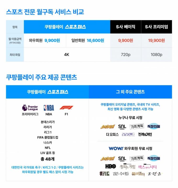 쿠팡플레이가 오는 8월 '스포츠 패스' 일반 회원 요금제를 출시한다. 스포츠 패스란 쿠팡플레이가 중계하는 스포츠 경기를 보기 위한 부가 서비스다. 쿠팡 와우 멤버십(월 7890원)을 구독하지 않는 경우 월 1만6600원을 내야 한다. 쿠팡 와우 회원은 월 9900원을 추가하면 된다.