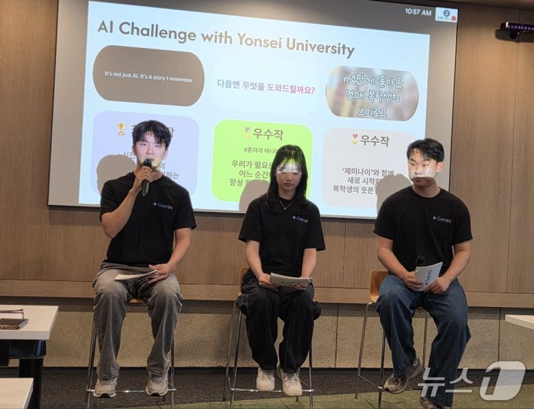 왼쪽부터 이노진 연세대 언론홍보영상학부 김은후 연세대 언론홍보영상학부 임도영 연세대 체육교육과 학생들이 서울 역삼동 구글 사무실에서 열린 제미나이 워크숍에서 발표하고 있다. 2025.6.20/뉴스1 ⓒ News1 김민석 기자 |