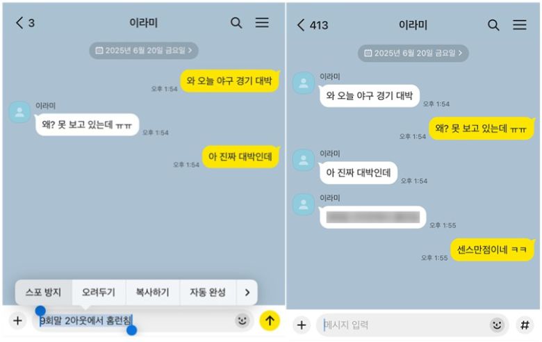 카카오톡에 도입된 '스포(미공개 내용을 알리는 행위를 뜻하는 '스포일러'의 줄임말) 방지' 기능 예시 화면 [사진=카카오] |