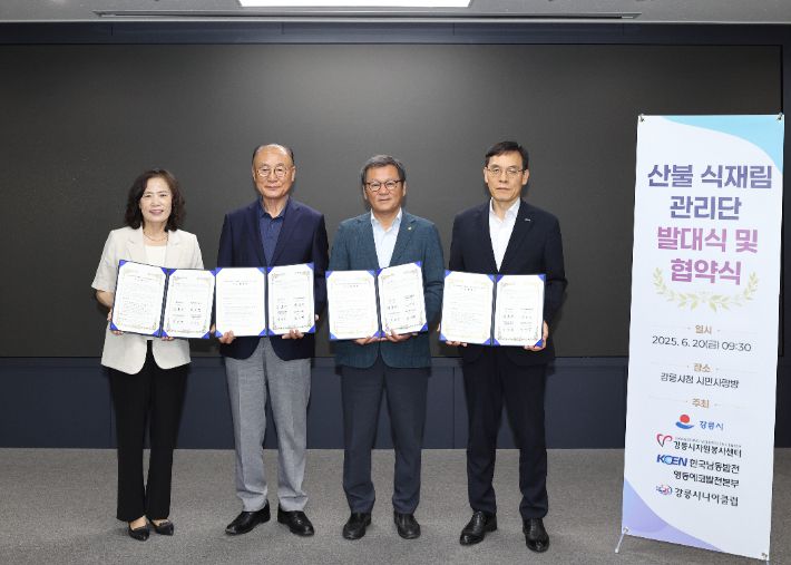 강릉시와 강릉시자원봉사센터, 한국남동발전 영동에코발전본부, 강릉시니어클럽은 20일 경포 산불피해지역에 심은 나무의 효율적 관리를 위해 산불식재림관리단을 구성 및 운영하기로 하고 발대식과 상호협약식을 개최했다.