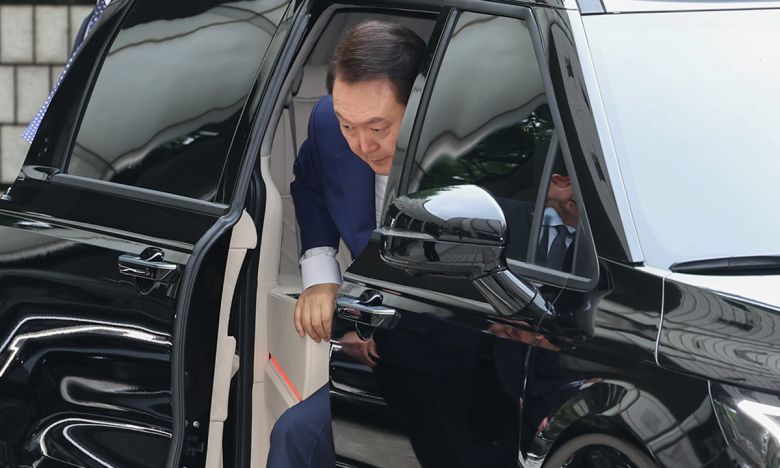 윤석열 전 대통령이 지난 16일 서울 서초구 서울중앙지방법원에서 열린 내란 우두머리 혐의·직권남용 권리행사 방해 혐의 사건 7차 공판에 출석하고 있다. 사진공동취재단 |