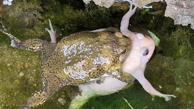 14일 대전 동구 직동 찬샘마을 맹꽁이 서식지에서 발견된 암컷 알비노(백색증) 맹꽁이(오른쪽). 문광연 한국양서파충류학회 이사 제공·뉴스1 |