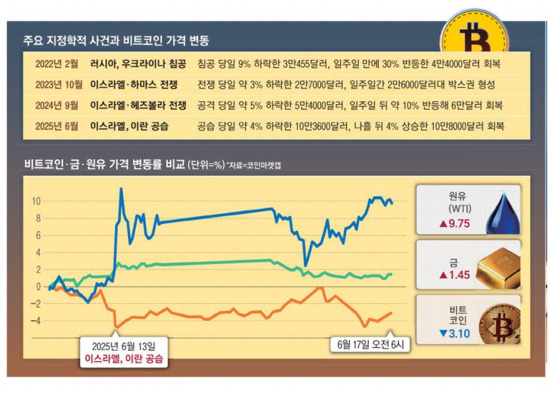 6월 들어 한때 11만달러를 회복하는 등 강세를 보였던 비트코인은 이스라엘의 이란 공습으로 13일 하루 동안 4%의 조정을 받았다. 전 세계 증시도 이날 지정학적 위기에 대한 우려로 동반 하락했다. 반면 금 현물은 안전자산 선호 현상으로 1.3% 오른 온스당 3448.1달러로 사상 최고치에 근접했다.
