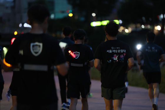 19일 오후 서울 서대문구 홍제천에서 서대문경찰서와 시민 러닝 크루로 이루어진 '서울 러닝 순찰대'가 첫 합동 순찰을 하고 있다. 연합뉴스 |