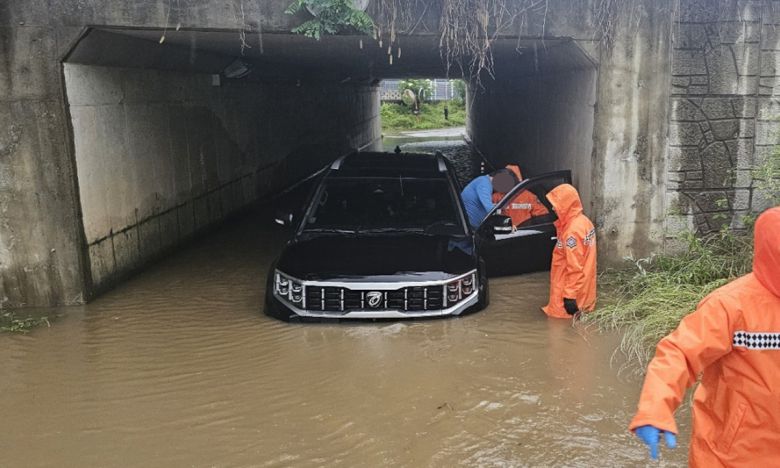 20일 경기 고양시 대화동의 한 지하차도에서 차량이 침수돼 소방대원들이 운전자를 구조하고 있다. 경기북부소방재난본부 제공