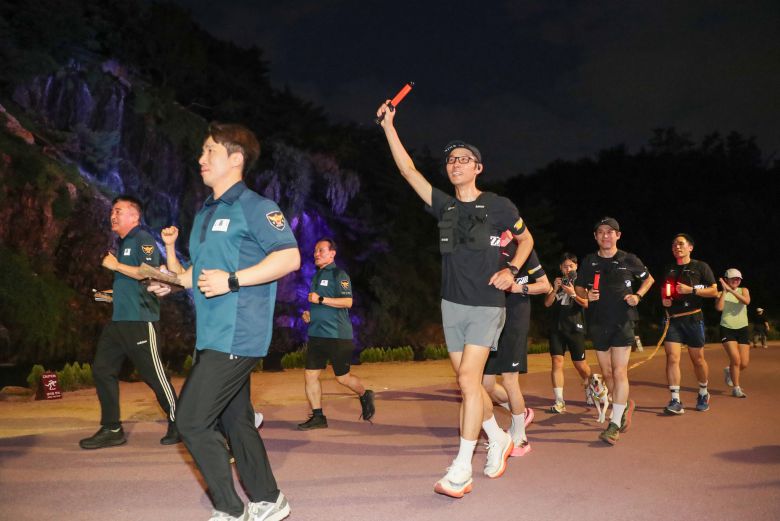 “위험해요, 안전모 쓰고 자전거 타주세요!” 19일 오후 8시 서울 강남구 잠원한강공원에서 변영훈(34)씨가 안전 조끼를 입고 붉은 경광봉을 든 채 이렇게 외쳤다. 그는 경찰이 아니다. 발목까지 오는 흰색 양말에 짧은 반바지, 형광색 러닝화를 신은 변씨는 강남 지역 러닝 크루(running crew·달리기 동호회) ‘런비’ 멤버다. 최근 2040 사이에서 인기를 끄는 러닝 크루 멤버들이 경찰관과 함께 ‘달리면서 하는 합동 순찰’에 나선 것이다. 변씨는 “공원 곳곳에 시민들에게 위험한 요소가 있는지 찾는 게 내 적성에 딱”이라며 “뛰면서 순찰하는 건 경찰 분들보다 자신이 있다”고 했다.