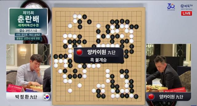 K바둑계 간판스타 박정환(32) 9단이 세계 메이저 기전인 ‘제15회 춘란배 세계프로바둑선수권대회’(우승상금 15만 달러, 약 2억400만 원) 결승 1국에서 중국 양카이원(28) 9단에게 완패했다. 이에 따라 박 9단의 ‘제15회 춘란배’(3번기·3판2선승제) 타이틀 획득에도 적신호가 켜졌다.