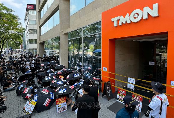 13일 서울 강남구 티몬 사옥 앞에서 티메프·큐텐 사태 피해 판매자 및 피해자 연합 회원들이 구영배 큐텐 대표 구속과 판매대금 환불을 촉구하고 있다. 2024.8.13 오장환 기자 |