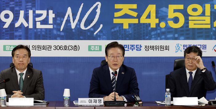 더불어민주당 대표 시절 이재명 대통령이 지난 3월 29일 국회 의원회관에서 열린 주4·5일제 도입 방안 마련을 위한 긴급 토론회에서 발언을 하는 모습. [김호영 기자] |