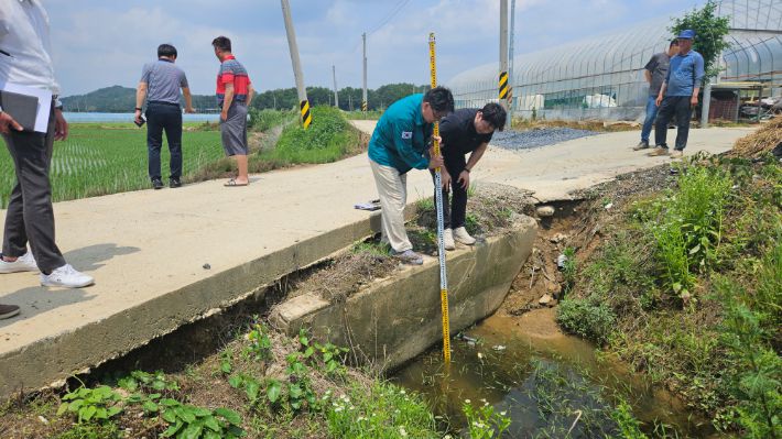 이정삼 도 농축산국장과 부여군·한국농어촌공사 관계자, 지역 주민들은 침수 우려 저지대 논밭, 배수로, 둠벙, 수리시설 등을 살피고 긴급 보수가 필요한 시설에 대해서는 즉각적인 조치가 이뤄지도록 했다.