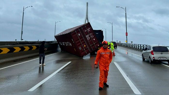 오늘(20일) 오후 5시 2분쯤 인천시 중구 인천대교 송도 방향 9.7㎞ 지점에서 대형 화물차에 실려 있던 컨테이너가 도로에 떨어졌습니다.
