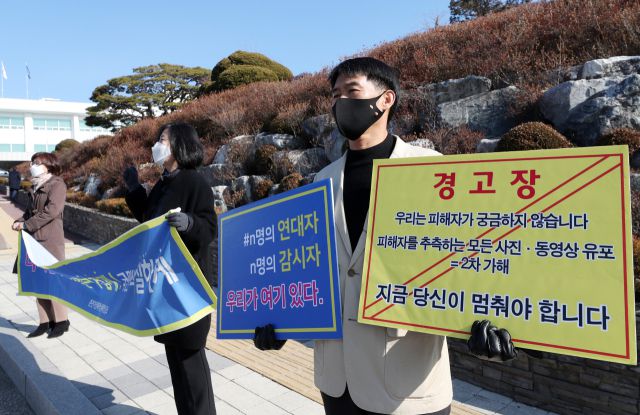 ▲2020년 12월 9일 이른바 '제2n번방'을 통해 미성년자 성 착취물을 제작·배포한 닉네임 '로리대장태범' 배모(18)군 등의 항소심 선고 공판이 열렸다. 강원 춘천지법 앞에서 디지털성폭력대응 강원미투행동연대 회원들이 재판부에 엄중 처벌을 촉구하고 있다. ⓒ연합뉴스