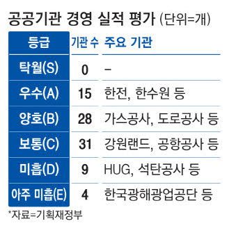 D등급은 대한석탄공사 등 9곳이었으며 E등급은 한국관광공사, 한국광해광업공단 등 4곳이었다.