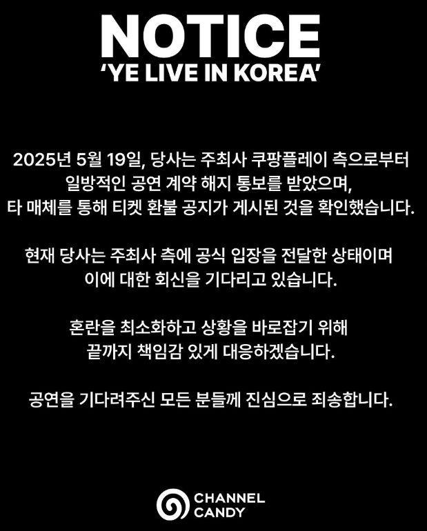 그런 가운데 당시 공연 주관사였던 채널캔디는 "주최사 쿠팡플레이 측으로부터 일방적인 공연 계약 해지 통보를 받았으며, 타 매체를 통해 티켓 환불 공지가 게시된 것을 확인했다"고 주장했다.
