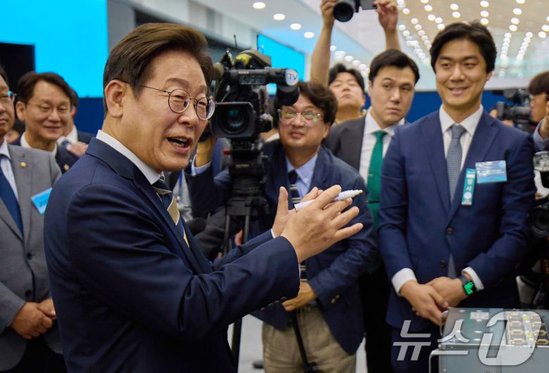 이재명 대통령이 20일 울산 울주군 울산전시컨벤션센터에서 열린 인공지능(AI) 글로벌 협력 기업 간담회 뒤 AI 제품·서비스 시연을 참관하고 있다. (대통령실 제공. 재판매 및 DB 금지) 2025.6.20/뉴스1 ⓒ News1 박지혜 기자 |