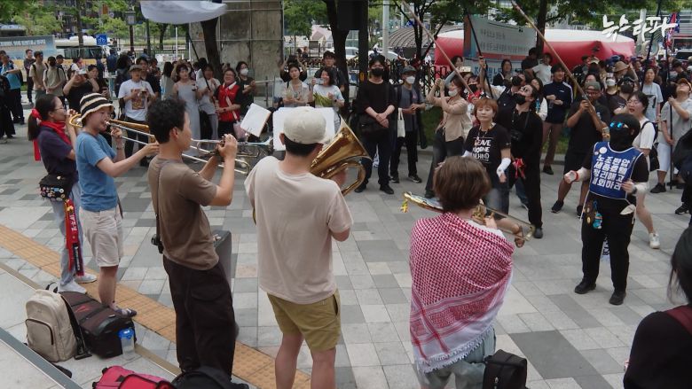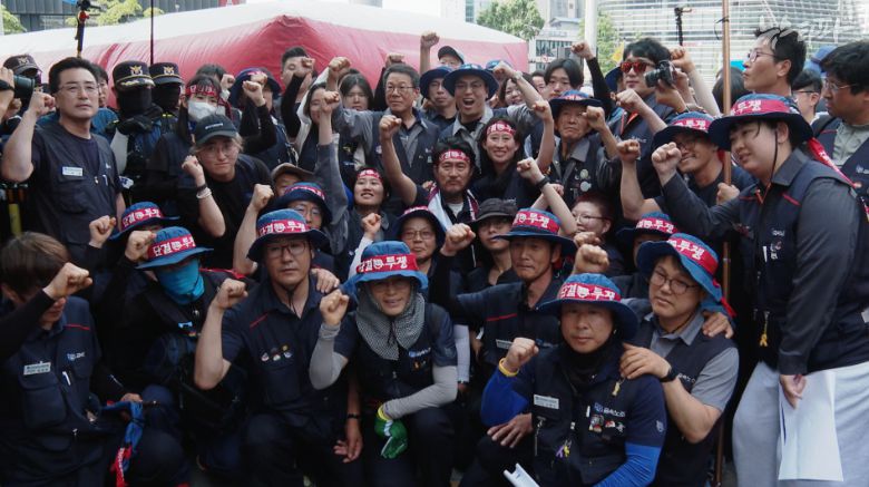 이날 서울 중구 한화 본사 앞에선 오후 2시부터 김 지회장의 고공농성 해제를 환영하는 기자회견이 열렸다. 기자회견장에는 거제에서 올라온 조선하청지회 조합원과 시민 등 수백 명의 인파가 모였다. 전날 경찰이 김 지회장을 집시법 위반 등의 혐의로 체포 영장 집행을 예고하면서, 농성장 주변엔 긴장감이 감돌았다.