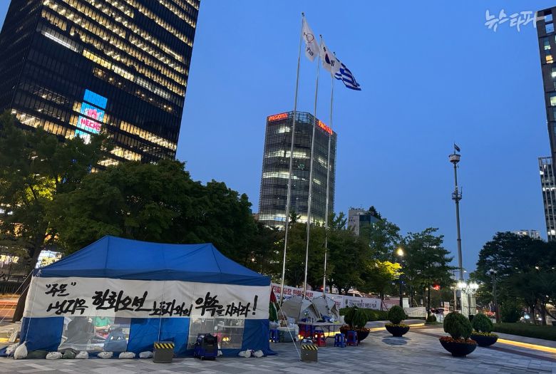 원청인 한화오션의 묵묵부답에 김 지회장은 지난해 말 국회 앞에서 22일간, 강인석 부지회장은 거제에서 49일간 단식농성도 했다. 12.3 내란 이후인 지난 1월 7일 부터는 거제의 조합원 일부가 서울 한화 본사로 상경해 천막 농성장을 차렸다. 그럼에도 원청인 한화오션은 교섭에 응하지 않았고, 하청업체와의 교섭도 진전이 없었다. 김 지회장은 결국 한화 본사 앞 철탑에 올라 고공농성을 시작하게 됐다.