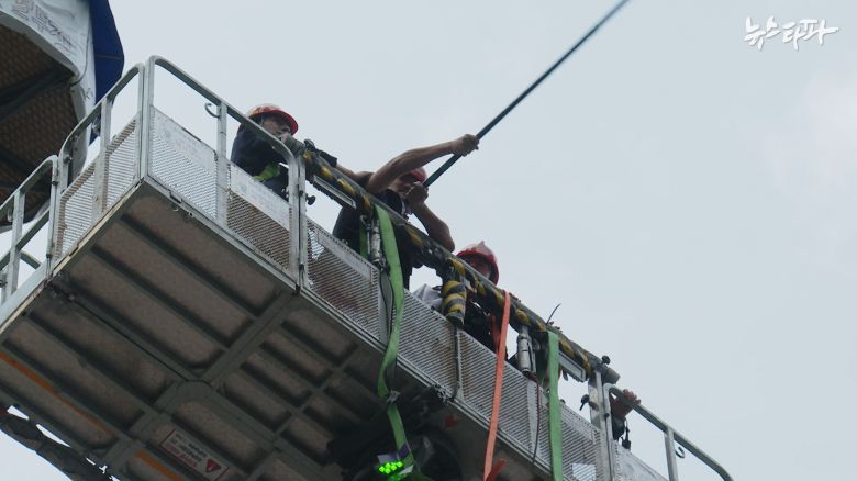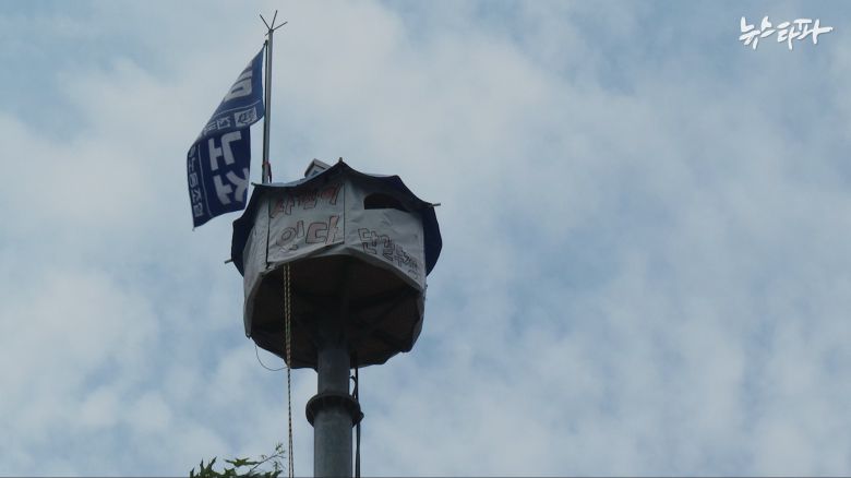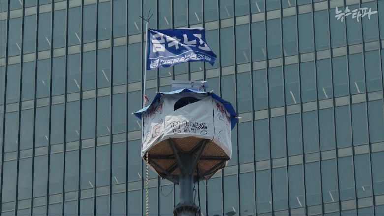 김 지회장은 최저 임금 수준인 한화오션 하청 노동자들의 임금 인상 등을 위해 지난 3월 15일 서울 중구 한화 본사 앞 30미터 높이의 CCTV 철탑에 올랐다. 흔들리는 철탑 위에서 몸을 제대로 펴지도 못한 채 100일 가까운 시간을 버텼다.