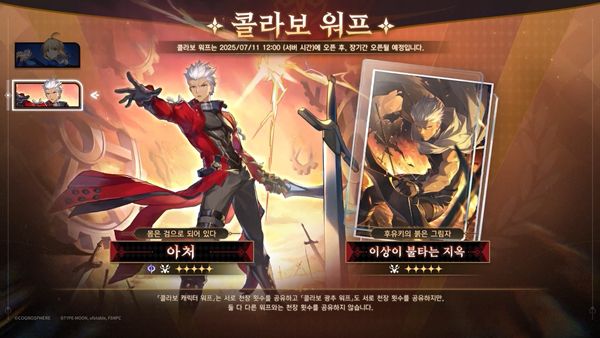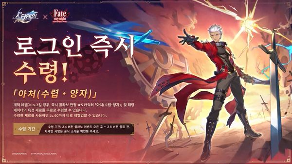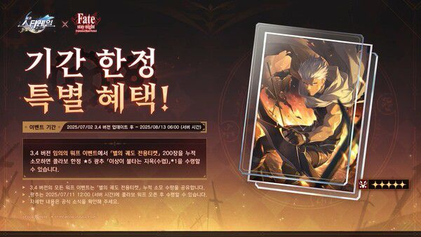 드디어 붕괴 스타레일과 페이트 스테이 나이트 UBW 컬래버레이션이 시작된다. 7월 11일 컬래버가 오픈되면 로그인 즉시 아처 캐릭터를 무료로 제공한다. 또한 컬래버 전용 워프, 이벤트를 만나볼 수 있다.
