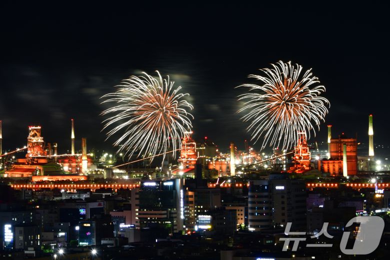 (포항=뉴스1) 최창호 기자 = 20일 경북 포항시 형산강 체육공원에서 열린 '2025 포항국제불빛축제'에서 데일리 불꽃쇼가 포스코 포항제철소를 배경으로 화려하게 펼쳐지고 있다. 2025.6.20/뉴스1