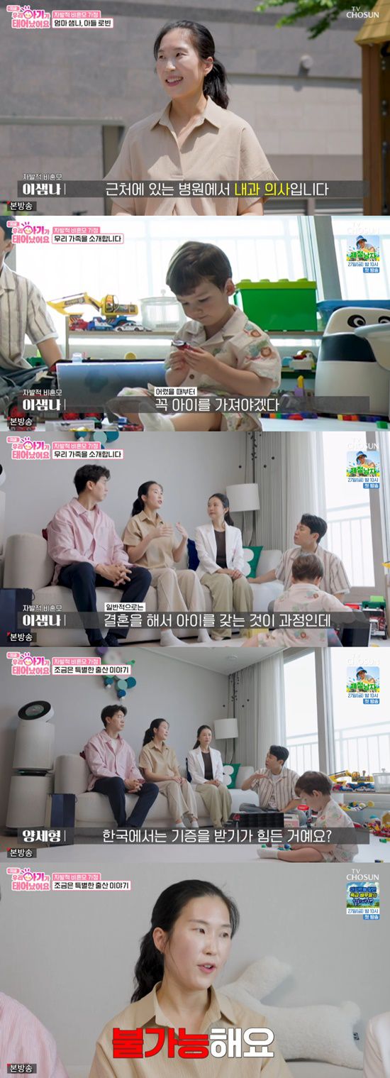 이샘나씨는 첫째 로빈을 정자은행을 통해 기증받은 정자로 출산했고, 둘째 출산을 앞두고 있다. 그는 "내과 의사로 일하고 있다"고 소개했다.