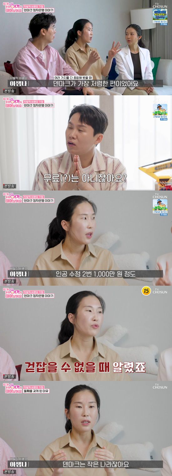 이샘나 씨 역시 "저는 덴마크에서 정자기증을 받았다. 영국과 먼저 접촉을 했었고 덴마크와 미국서 알아봤다. 여러가지를 종합했을 때 덴마크가 가장 저렴한 편"이라고 했다.