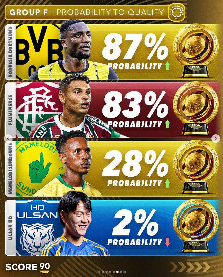 글로벌 축구매체 '스코어90'은 20일(한국시간) 사회관계망서비스(SNS)를 통해 "최신 확률에 따른 클럽 월드컵 조별리그 예선 통과 확률"이라고 보도했다.